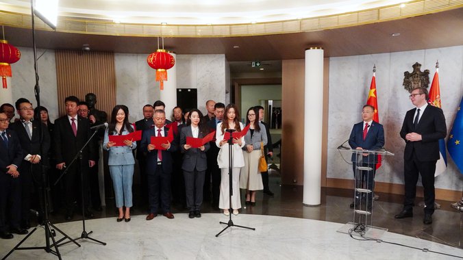 Ambasador Kine u Srbiji Li Ming obratio se okupljenima i rekao da su dirnuti i počastvovani što je danas predsednik Vučić priredio ovaj prijem na visokom nivou, povodom kineske Nove godine.