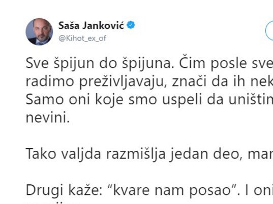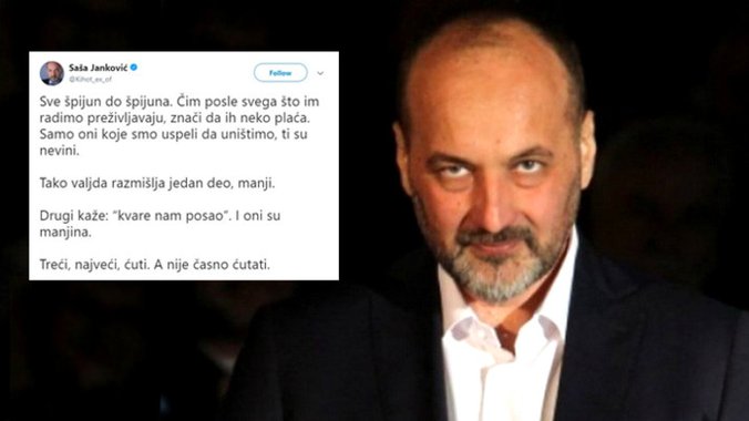 - Sve špijun do špijuna. Čim posle svega što im radimo preživljavaju, znači da ih neko plaća. Samo oni koje smo uspeli da uništimo, ti su nevini. Tako valjda razmišlja jedan deo, manji. Drugi kaže: "kvare nam posao". I oni su manjina. Treći, najveći, ćuti. A nije časno ćutati – napisao je Janković na svom tviter nalogu.