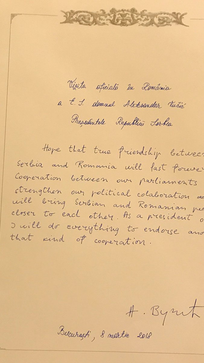 Predsednik Srbije upisao se u Knjigu počasnih gostiju rumunskog parlamenta. Predsednik Srbije, koji boravi u jednodnevnoj poseti Bukureštu, sastao se sa predsednikom Predstavničkog doma parlamenta Livijom Dragneom, nakon što je razgovarao i sa predsednikom Senata parlamenta Kalinom Popeskuom Tarićanuom. Šef srpske države, sa predsednicima oba doma rumunskog parlamenta, obišao je zdanje skupštine. Predsednik Srbije prethodno se sastao sa predsednikom Rumunije Klausom Johanisom, a održali su i zajedničku konferenciju za medije na kojoj su istakli prijateljske odnose dve zemlje. Vučić se zatim sastao i sa premijerkom Rumunije Vjorikom Danćilom koja je u njegovu čast priredila radni ručak, a teme razgovora su bile evropske integracije, ekonomska saradnja i bilateralni odnosi. Na kraju jednodnevne posete predsednik Srbije će položiti venac na Spomenik neznanom junaku.