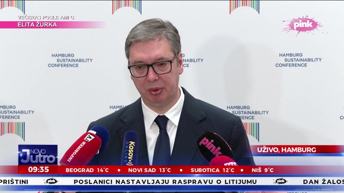 Predsednik Aleksandar Vučić obratuo se medijima nakon učešća na panelu "Pregovori o novoj alijansi - odgovoran i kružni lanac snabdevanja baterijama" u Hamburgu.
