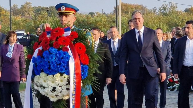 Predsednik Srbije Aleksandar Vučić i predsednik Mađarske Tamaš Šujok danas su u Čurugu položili vence na Spomenik pomirenja, kao i u Muzeju žrtava racije "Topalov magacin".
