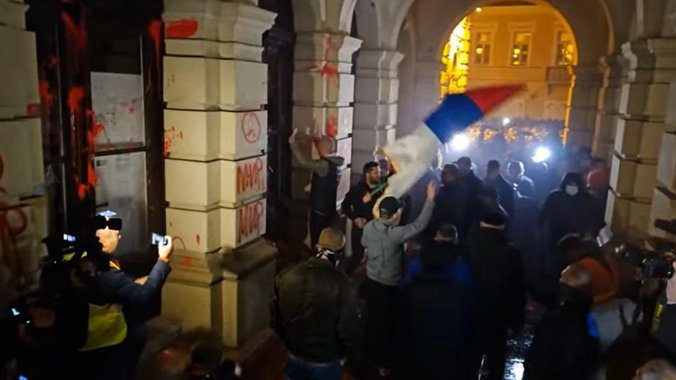 Naime, pristalice opozicije su snimljene kako razbijaju staklo na Gradskoj kući i nogama šutiraju i pokušavaju da razvale vrata. U jednom trenutku, oni su ubacili upaljenu baklju u sam objekat.