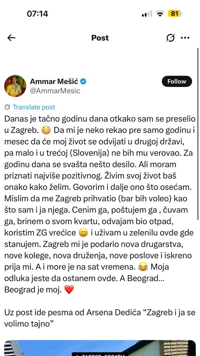 - Danas je tačno godinu dana otkako sam se preselio u Zagreb. Da mi je neko rekao pre samo godinu i mesec da će moj život se odvijati u drugoj državi, pa malo i u trećoj (Slovenija) ne bih mu verovao. Za godinu dana se svašta nešto desilo. Ali moram priznati najviše pozitivnog. Živim svoj život baš onako kako želim. Govorim i dalje ono što osećam. Mislim da me Zagreb prihvatio (bar bih voleo) kao što sam i ja njega. Cenim ga, poštujem ga , čuvam ga, brinem o svom kvartu, odvajam bio otpad, koristim ZG vrećice i uživam u zelenilu ovde gde stanujem. Zagreb mi je podario nova drugarstva, nove kolege, nova druženja, nove poslove i iskreno prija mi. A i more je na sat vremena. Moja odluka jeste da ostanem ovde. A Beograd… Beograd je moj. Uz post ide pesma od Arsena Dedića “Zagreb i ja se volimo tajno”.