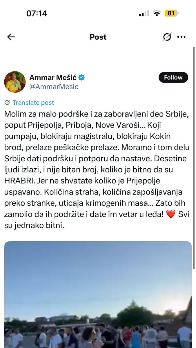 - Molim za malo podrške i za zaboravljeni deo Srbije, poput Prijepolja, Priboja, Nove Varoši… Koji pumpaju, blokiraju magistralu, blokiraju Kokin brod, prelaze peškačke prelaze. Moramo i tom delu Srbije dati podršku i potporu da nastave. Desetine ljudi izlazi, i nije bitan broj, koliko je bitno da su HRABRI. Jer ne shvatate koliko je Prijepolje uspavano. Količina straha, količina zapošljavanja preko stranke, uticaja krimogenih masa… Zato bih zamolio da ih podržite i date im vetar u leđa! Svi su jednako bitni - napisao je Mešić juče na svom Iks profilu i podelio snimak blokadera koji blokiraju jednu saobraćajnicu.