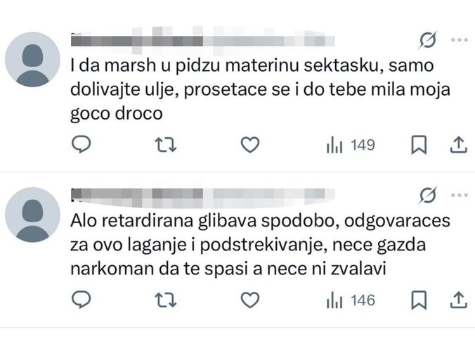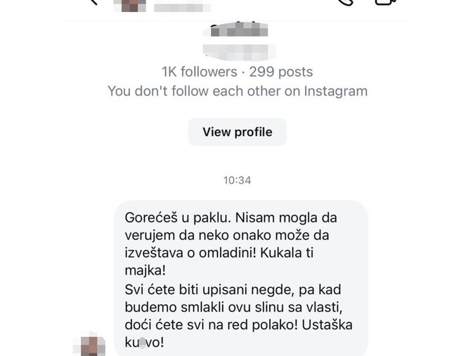 - Gorećeš u paklu. Nisam mogla da verujem da neko onako može da izveštava o omladini! Kukala ti majka! Svi ćete biti upisani negde, pa kad budemo smakli ovu slinu sa vlasti, doći ćete svi na red polako! Ustaška kurvo! - piše u jednoj od objava koje su joj upućene.