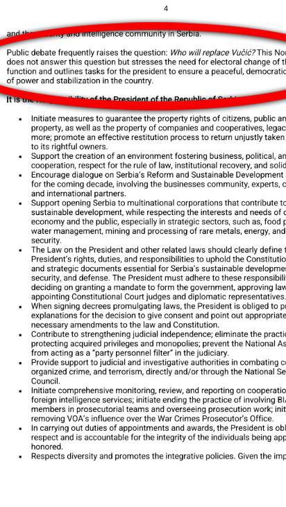 "Zbog ozbiljnih bezbednosnih izazova, poseban fokus je na ulozi predsednika, Saveta za nacionalnu bezbednost i bezbednosno-obaveštajnih službi. Ne pitanje "ko će zameniti Vučića - već kako omogućiti demokratsku smenu i miran prenos vlasti", piše u non pejperu koji je Dušan Janjić poslao 13. avgusta, a koji je kako je naveo - namenjen domaćim i međunarodnim društvenim, poslovnim, političkim i drugim akterima čije aktivnosti utiču na tok aktuelne krize u Srbiji.