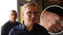 Predsednik Srbije Aleksandar Vučić stigao je sinoć, samo nekoliko minuta od incidenta, ispred uništenih prostorija SNS-a u Cvijićevoj ulici.