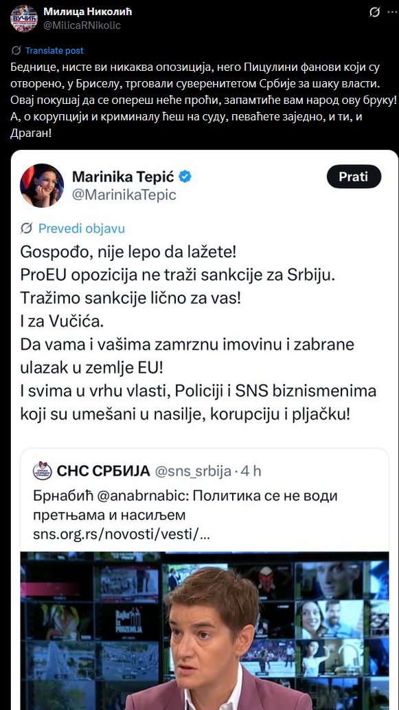 - Bednice, niste vi nikakva opozicija, nego Piculini fanovi koji su otvoreno, u Briselu, trgovali suverenitetom Srbije za šaku vlasti.Ovaj pokušaj da se opereš neće proći, zapamtiće vam narod ovu bruku!A, o korupciji i kriminalu ćeš na sudu, pevaćete zajedno, i ti, i Dragan - rekla je Nikolić na svom X nalogu.