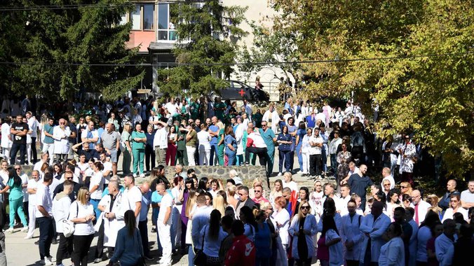Zdravstveni radnici zaposleni u KBC Kosovska Mitrovica i domovima zdravlja u četiri severne opštine organizovali su protestni skup povodom sinoćnjeg upada pripadnika tzv. kosovske policije u prostorije obezbeđenja KBC Kosovska Mitrovica i Doma zdravlja Kosovska Mitrovica.