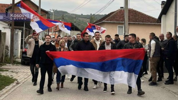 Veliki broj Srba iz opštine Novo Brdo, iz mesta Gornje Kusce, krenuo je na glasanje, a na čelu kolone nose srpsku trobojku.