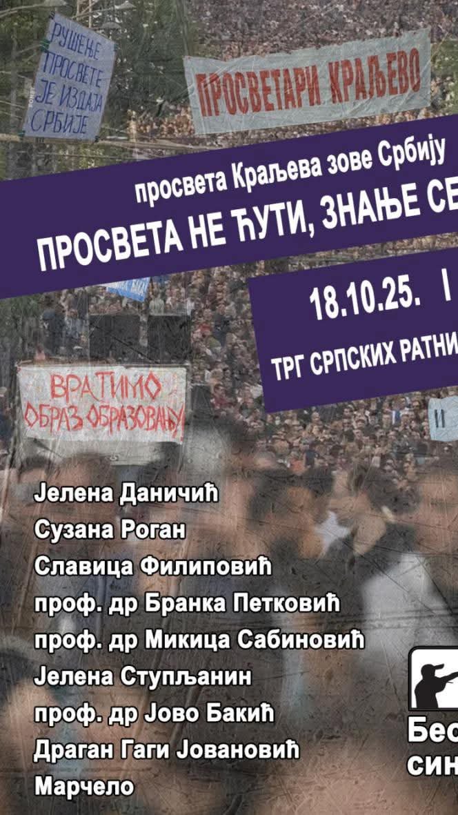 Kako se navodi, protest je organizovan od strane grupe prosvetara, a očekuje se i obraćanje uobičajenih vedeta blokadera - Jova Bakića, glumca Dragana Jovanovića, muzičara Marčela i drugih.