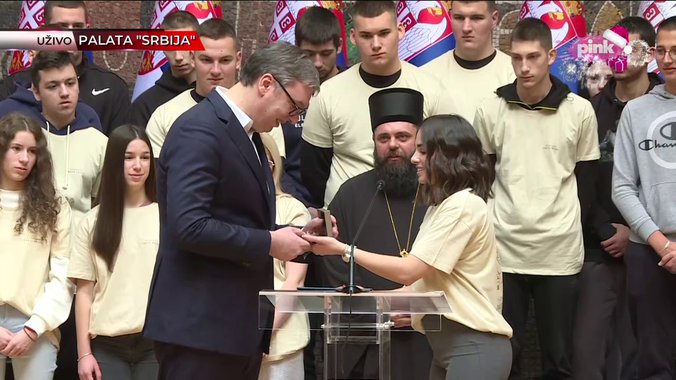Maja Nedić, učenica trećeg razreda Tehničke škole “Nikola Tesla”, uručila je predsedniku Vučiću zlatnik, u znak sećanja na učenike iz Vukovara.