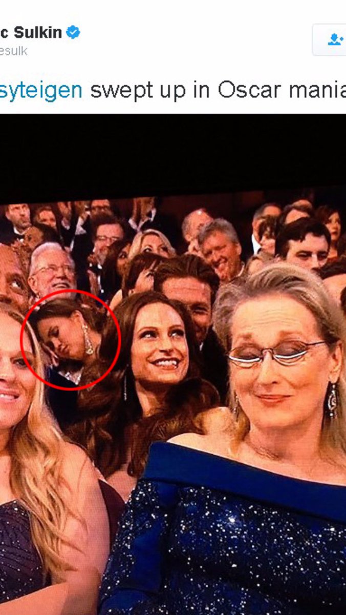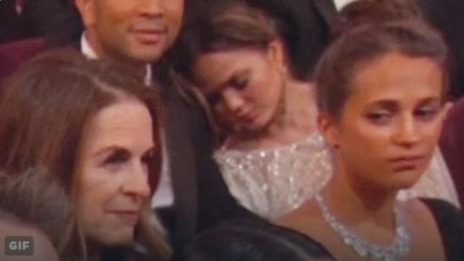 Menkenka i supruga Džona Leženda prespavala je sinoćnji fijasko i tako postala jedna od glavnih atrakcija sa ove svečanosti. Čak dva puta kamera je uhvatila Krisi Tajgen kako sklopljenih očiju drema naslonjena na rame svog supruga, muzičara Džona Ledženda.