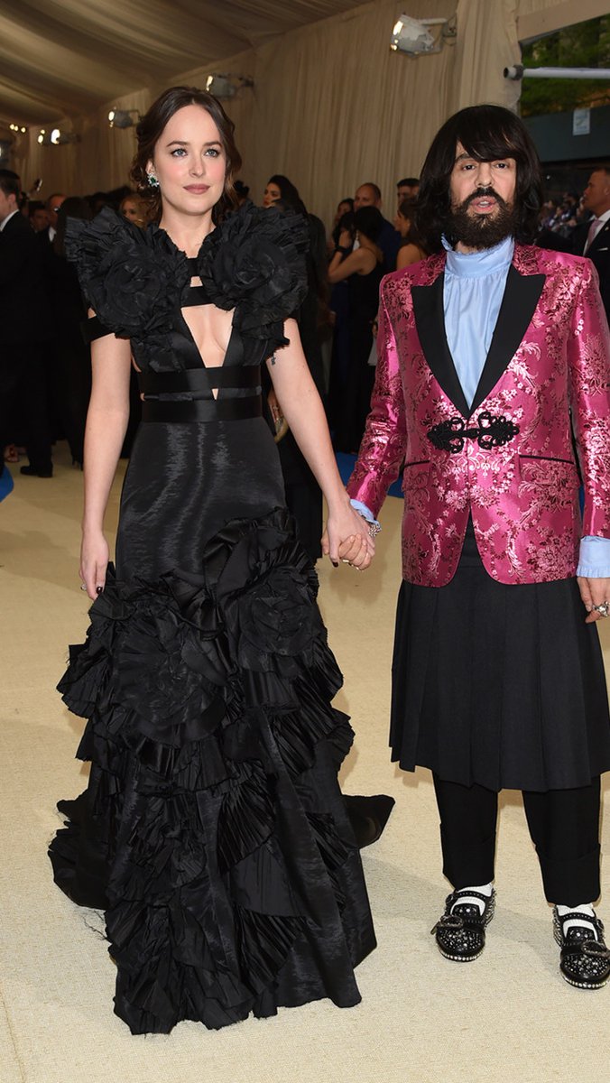 Dakota Džonsoni pojavila se u dugoj crnoj haljini, a nju je u senku bacio dizajner Alesandro Mišael koji je na sebiima plavu košulju sa karnerima, rozi sako sa cvetnim printom, suknji i nešto nalik opankama sa nitnama.