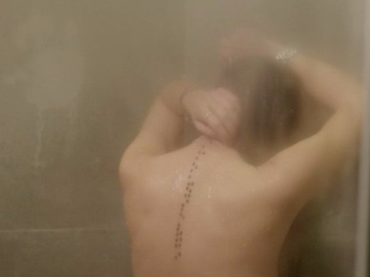 Osim što se, na oduševljenje muškaraca, skinula potpuno gola, pažnju je privukla i njena neobična tetovaža na leđima, sačinjena od niza tačaka.