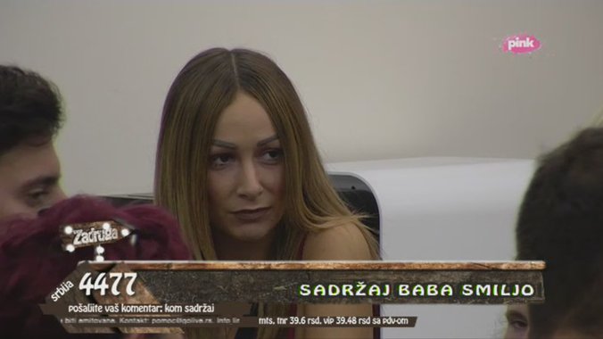 Ušla sam u garderobu i videla Lunu da čita neki papirić, neko pismo. Rekla mi je da ćutim, ali pošto je Sloba bezobrazan, biću i ja. Verovatno se dopisuju jer ne smeju da pričaju zbog njegove žene, sad su rešili da se dopisuju. Između njih ima nečeg ozbiljnog, ali neće on pred kamerama da otkrije. Međutim, mislim da će do kraja rijalitija popustiti.