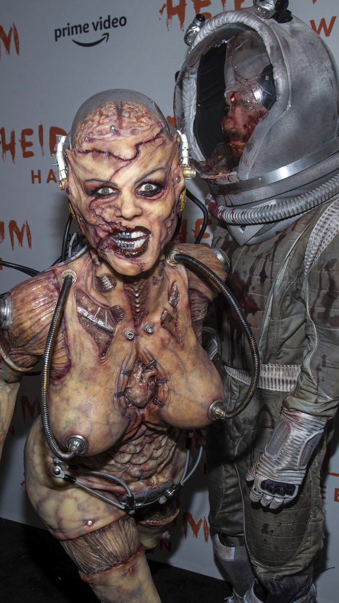 Supermodel koja je postala TV ličnost, Hajdi Klum, voli da iznenađuje svoje goste svojim elaboriranim kostimima, kao 2022. godine, kada je na događaj stigla na kraju ribarske linije, ogrnuta kostimom crva koji klizi, piše "US news".
