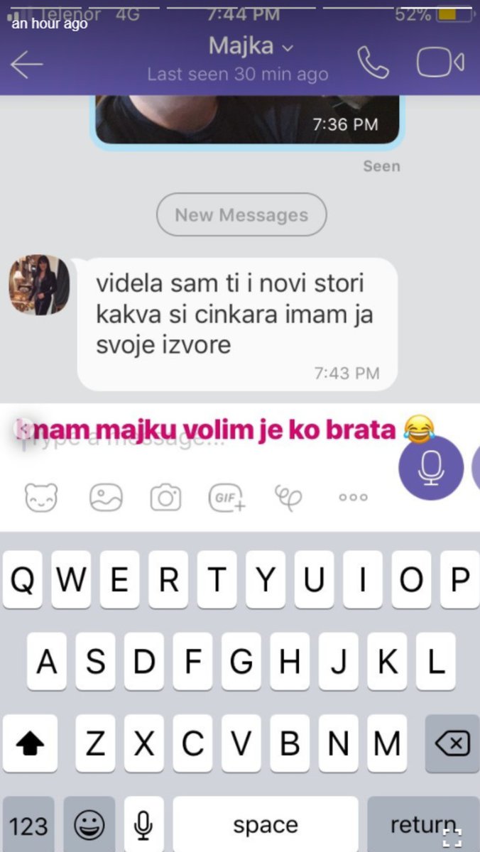 - Videla sam ti i novi stori. Kakva si cinkara, imam ja svoje izvore - glasi njena poruka.