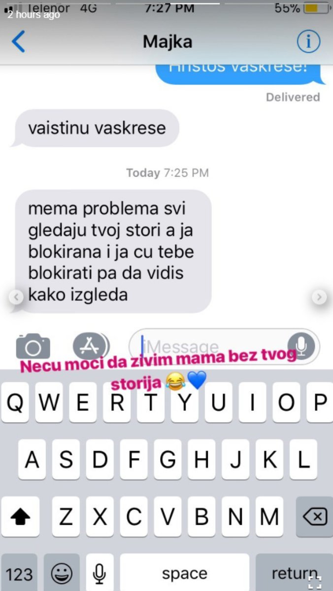 - Nema problema. Svi gledaju tvoj stori, a ja blokirana. I ja ću tebe blokirati, pa da vidiš kako izgleda - napisala mu je ona.