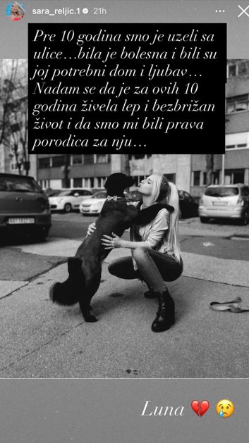 - Pre 10 godina smo je uzeli sa ulice, bila je bolesna i bili su joj potrebni dom i ljubav. Nadam se da je za ovih 10 godina živela lep i bezbrižan život i da smo mi bili prava porodica za nju - napisala je Sara Reljić.