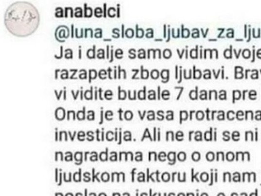 Ja i dalje samo vidim dvoje ljudi razapetih zbog ljubavi. Bravo ako vi vidite budale 7 dana pre kraja, onda je to vaša protraćena investicija. Ali ne radi se ni o nagradama nego o onom ljudskom faktoru koji nam je Bog poslao na iskušenje, e sad padamo li na testu ili ne, zavisi od nas samih - komentarisala je Anabela na Instagramu.