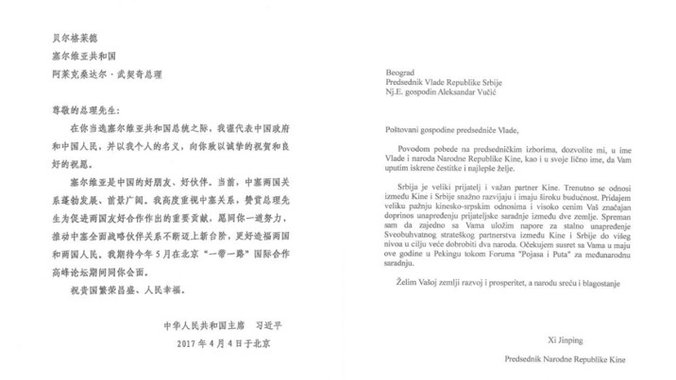 - Srbija je veliki prijatelj i važan partner Kine. Trenutno se odnosi između Kine i Srbije snažno razvijaju i imaju široku budućnost. Pridajem veliku pažnju kinesko - srpskim odnosima i visoko cenim vaš značajan doprinos unapređenju prijateljske saradnje između dve zemlje. Spreman sam da zajedno sa vama uložim napore za stalno unapređenje Sevobuhvatnog strateškog partnerstva između Srbije i Kine u cilju veće dobrobiti dva naroda. Očekujem susret sa Vama u maju ove godine u Pekingu tokom Foruma "Pojasa i Puta" za međunarodnu saradnju - istakao je Si Đinping.