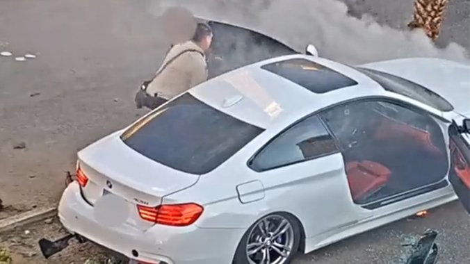 Footage published by Las Vegas Metropolitan Police shows an officer and a bystander rescuing the driver.