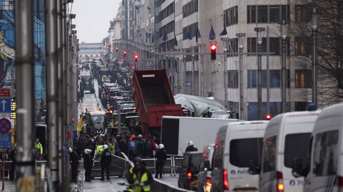 Poljoprivrednici su napravili betonske barijere i bodljikavim žicama su okružili sedište Evropske unije. Traktori su okićeni zastavama i transparentima, a demonstranti bacaju i gume ispred ulaza u zgradu EU.
