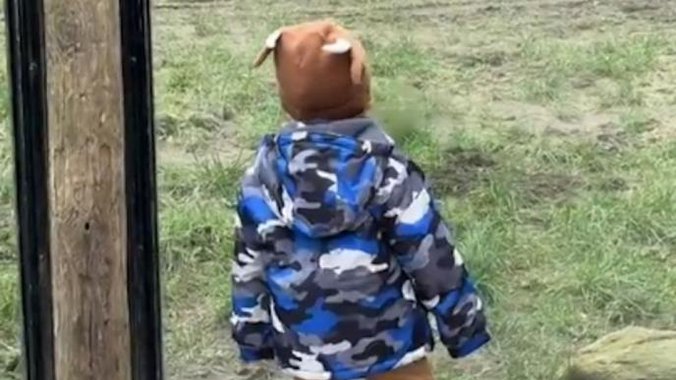 Mališan gleda u lava, potom se okreće ka roditeljima koji ga snimaju, a za to vreme lav pravi par koraka.