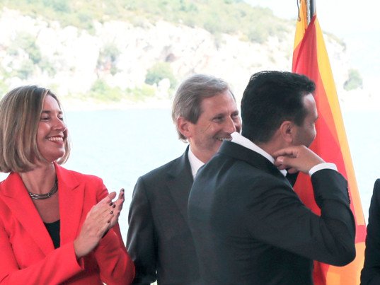 Visoka predstavnica EU za spoljne poslove i bezbednost Federika Mogerini i komesar za evropsku susedsku politiku i pregovore o proširenju ocenili su, nakon ceremonije potpisivanja Sporazuma o rešavanju makedonsko-grčkog spora oko imena i strateškom partnerstvu, da je "ovo istorijski dan" za dve zemlje.