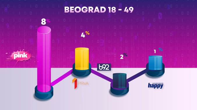 Televizija Pink bila je gledanija od svih komercijalnih emitera u totalu, među gledaocima starosti od 18 do 49 godina, među ženskom publikom starosti od 18 do 49 godina, među gledaocima sa teritorije Beograda, među gledaocima iz prestonice starosti od 18 do 49 godina i među urbanom populacijom, dok je i od Javnog servisa Srbije bila gledanija među ženskom publikom.