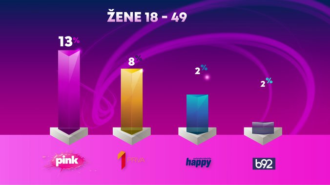 Televizija Pink je od svih komercijalnih emitera bila gledanija u totalu, među gledaocima starosti od 18 do 49 godina, među ženskom publikom starosti od 18 do 49 godina, među gledaocima sa teritorije Beograda i među urbanom populacijom, dok je i od Javnog servisa Srbije bila gledanija među ženskom publikom.