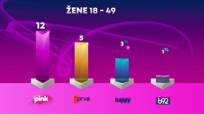 Televizija Pink je od svih komercijalnih emitera bila gledanija u totalu, među gledaocima starosti od 18 do 49 godina, među ženskom publikom starosti od 18 do 49 godina, među gledaocima sa teritorije Beograda, među gledaocima iz prestonice starosti od 18 do 49 godina i među urbanom populacijom, dok je i od Javnog servisa Srbije bila gledanija među ženskom publikom.