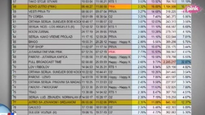 Uporednom analizom rezultata gledanosti programa koji proizvode Jovana i Srđan i Novog jutra televizije Pink, potpuno je jasno da je Pinkov program značajno gledaniji prethodnih dana.