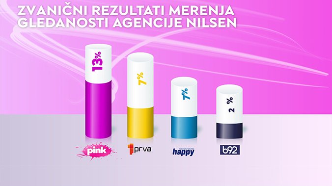 Televizija Pink je od svih komercijalnih emitera bila gledanija u totalu, među gledaocima starosti od 18 do 49 godina, među ženskom publikom starosti od 18 do 49 godina, među gledaocima sa teritorije Beograda, među gledaocima iz prestonice starosti od 18 do 49 godina i među urbanom populacijom, dok je i od Javnog servisa Srbije bila gledanija među ženskom publikom.