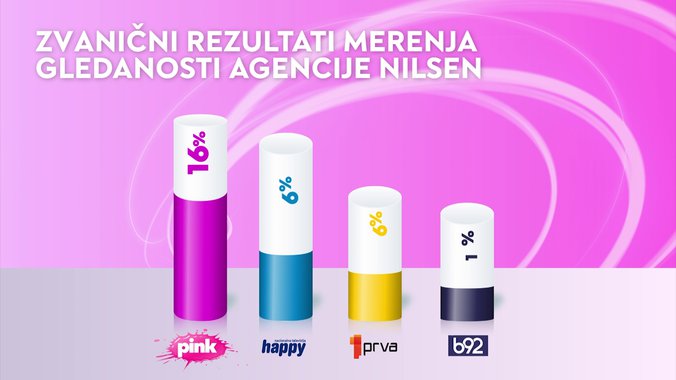 Televizija Pink je od svih komercijalnih emitera bila gledanija u totalu i među gledaocima starosti od 18 do 49 godina, dok je i od Javnog servisa Srbije bila gledanija među ženskom publikom, među ženskom publikom starosti od 18 do 49 godina, među gledaocima sa teritorije Beograda, među gledaocima iz prestonice starosti od 18 do 49 godina, kao i među urbanom populacijom.