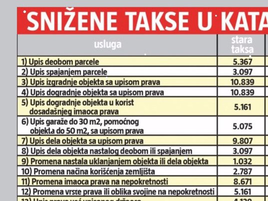 Jeftinije su takse za spajanje i deobu parcela, kao i izgradnju ili dogradnju objekata. Najviše je snižena taksa za upis zabeležbe postojanja ugovora o doživotnom izdržavanju, koja sada iznosi 3.000 dinara, dok je stara taksa koštala 6.710 dinara, što je pojeftinjenje od 55,3 odsto.