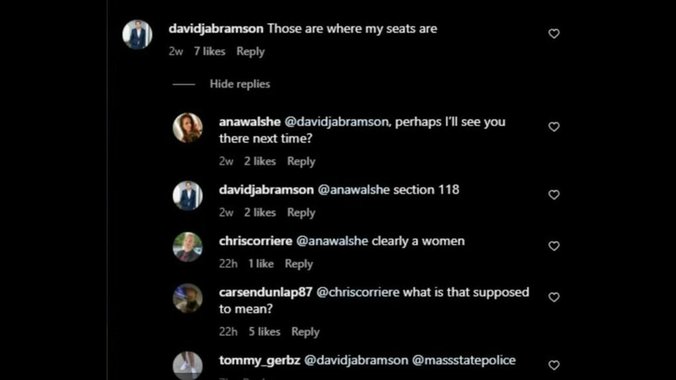 Komentar korisnika davidjabramson izazvao je najviše pažnje, a on je napisao "Tamo su moja sedišta". Njegov komentar ima sedam "sviđanja" među kojima je i "lajk" nestale Ane. Ona ga je označila i pitala "možda se vidimo tamo sledeći put?" Izvesni Dejvid je napisao "section 118", što u prevodu sa engleskog jezika znači "član 118".