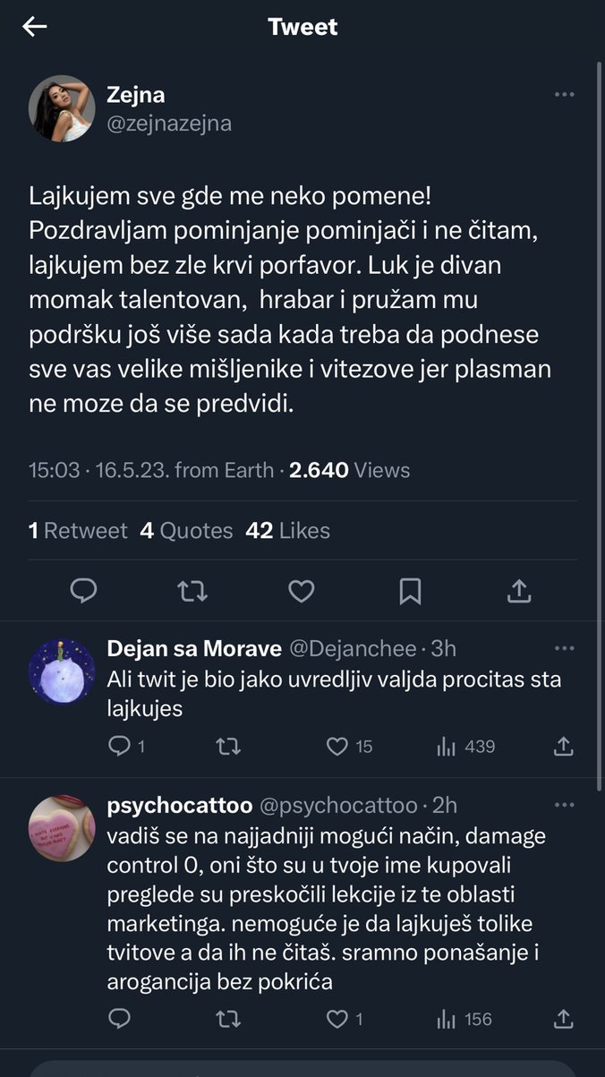 Lajkujem sve gde me neko pomene. Pozdravljam pominjanje pominjači i ne čitam, lajkujem bez zle krvi. Lukje divan momak, talentovan, hrabar i pružam mu podršku još više sad kad treba da podnese sve vas velike mišljenike i vizezove jer plasman ne može da se predvidi.