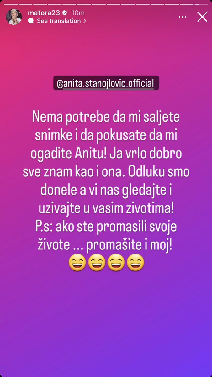 - Nema potrebe da mi šaljete snimke i da pokušate da mi igradite Anitu! Ja vrlo dobro sve znam kao i ona. Odluku smo donele a vi nas geldajte i uživajte u vašim životima! P.S: Ako ste promašili svoje živote, promašite i moj! - napisala je Tomićeva, uz emotikone koji se smeju.