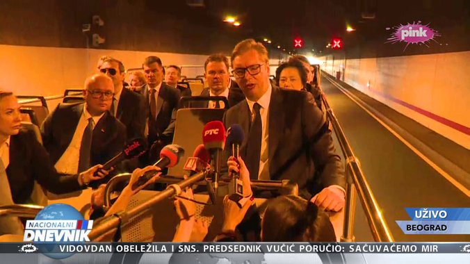 Sa Vučićem su u autobusu i ministri Siniša Mali i Goran Vesić, gradonačelnik Beograda Aleksandar Šapić, kao i ambasadorka Kine Čen Bo i predstavnici Puteva Srbije, Koridora Srbije i izvođača radova.