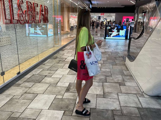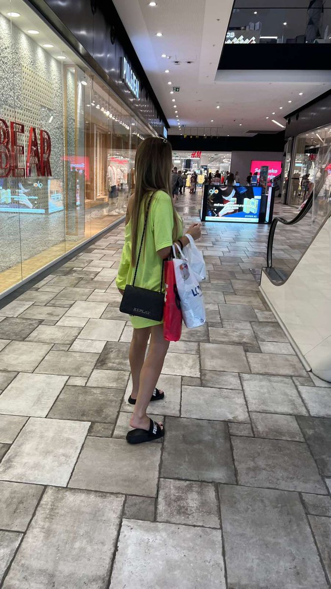 Naš paparaco zatekao je Aleks kako vreli julski dan provodi u jednom tržnom centu, u jako opuštenom izdanju. Ona je na sebi imala neon haljinu i papuče, a kosa joj je bila puštena.