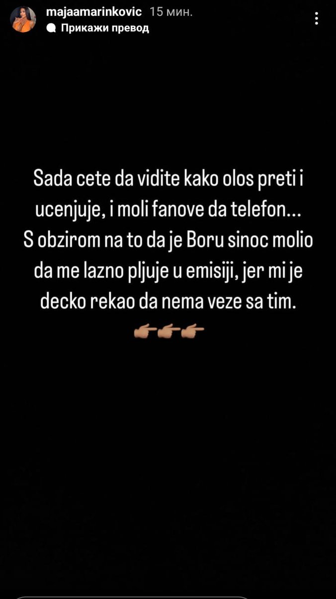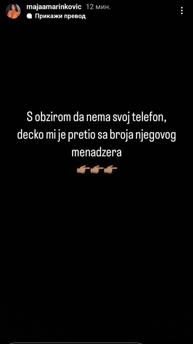 - Rekao mi je:'' Šutnuo sam ovu!'' Kazao je da je Taki došao po nju. Navodno mu je pravila velike probleme, nije smeo od nje da ode do toaleta u nekom kafiću - rekao je Terza, a sad se Maja oglasila na svom Instagram profilu, te otkrila da je Brajlović molio Boru da je pljuje, a onda je rešila da u javnost pusti užasne poruke kojim je Bilal bombarduje sa broja svog menadžera, budući da nema svoj telefon trenutno.
