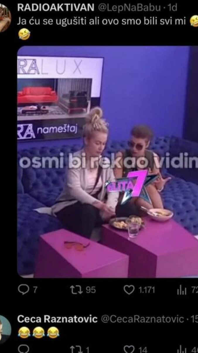 Jedan od viralnijih snimaka ovih dana na društvenim mrežama jeste onaj iz "Elite", gde Miljana Kulić od svoje cimerke Milice Veličković traži da joj dešifruje tekst Cecinog hita "Manta, manta".