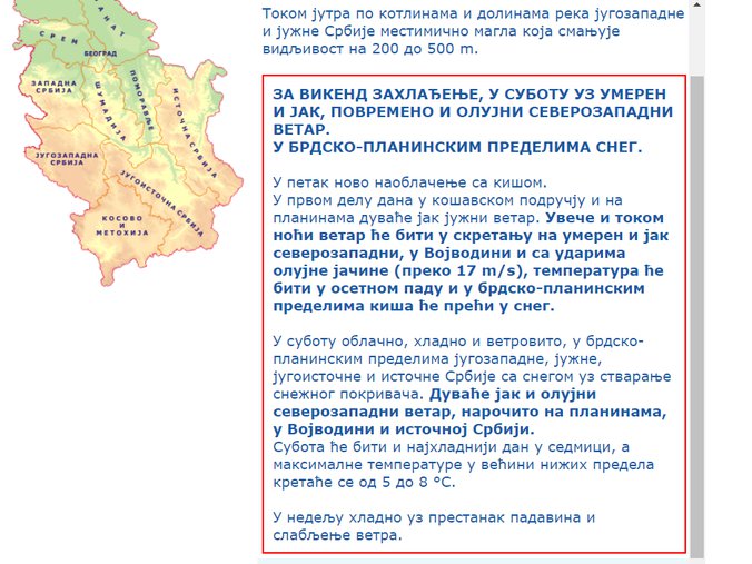 Uveče i tokom noći vetar će biti u skretanju na umeren povremeno i jak severozapadni, temperatura će biti u osetnom padu, a sa padom temperature kiša će krajem dana i tokom noći preći u sneg u brdsko-planinskim predelima jugozapadne, južne, jugoistočne i istočne Srbije.