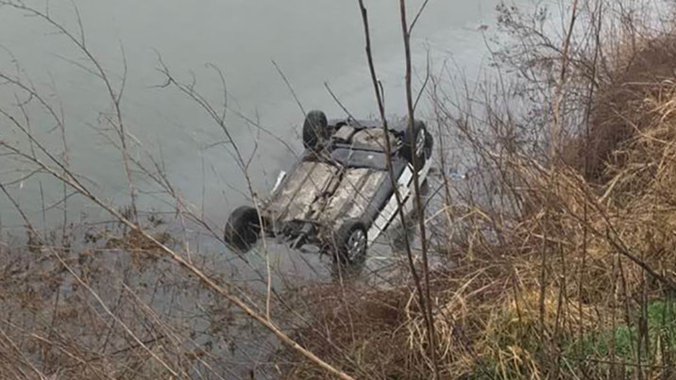 Automobil je okrenut na krov i potopljen u vodi.