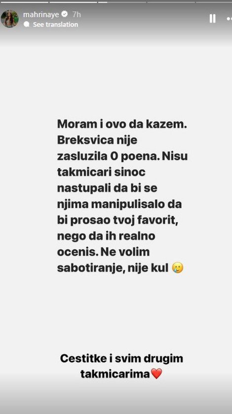 - Moram i ovo da kažem. Breskvica nije zaslužila 0 poena. Nisu takmičari sinoć nastupili da bi se njima manipulisalo da bi prošao tvoj favorit, nego da ih realno oceniš. Ne volim sabotiranje, nije kul - poručila je Mahrina.