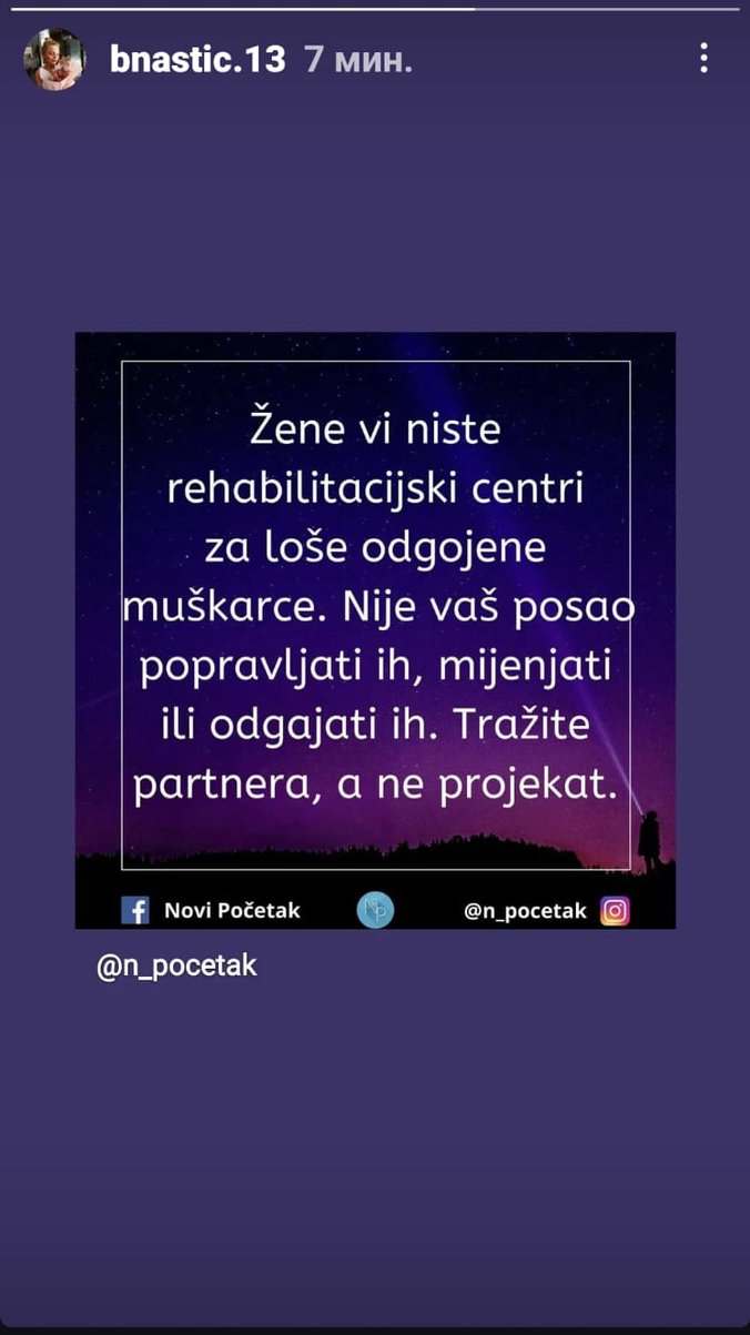 - Žene vi niste rehabilitacijski centri za loše odgojene muškarce. Nije vaš posao popravljati ih, menjati ih ili odgajati ih. Tražite partnera, a ne projekat - pisalo je na fotografiji, a da li je ovo bilo upućeno Ša i kako će on reagovati ako za ovo sazna, ostaje nam samo da ispratimo.