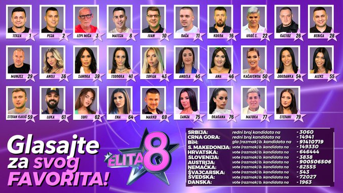 Sinoć je u Eliti održano drugo Finalno izbacivanje, a Elitu je zauvek napustio Milovan Minić, koji je imao najmanje glasova publike. Veliko superfinale "Elite 8" zakazano je za 19. jul, subotu, sa početkom od 21 čas uživo na Pink televiziji.