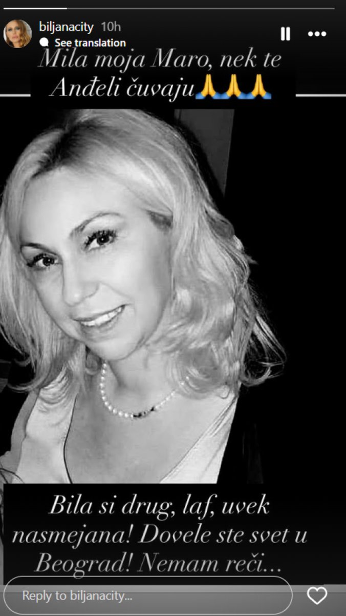 - Mila moja Maro, nek te anđeli čuvaju. Bila si drug, laf, uvek nasmejana! Dovele ste svet u Beograd! Nemam reči - napisala je ona.